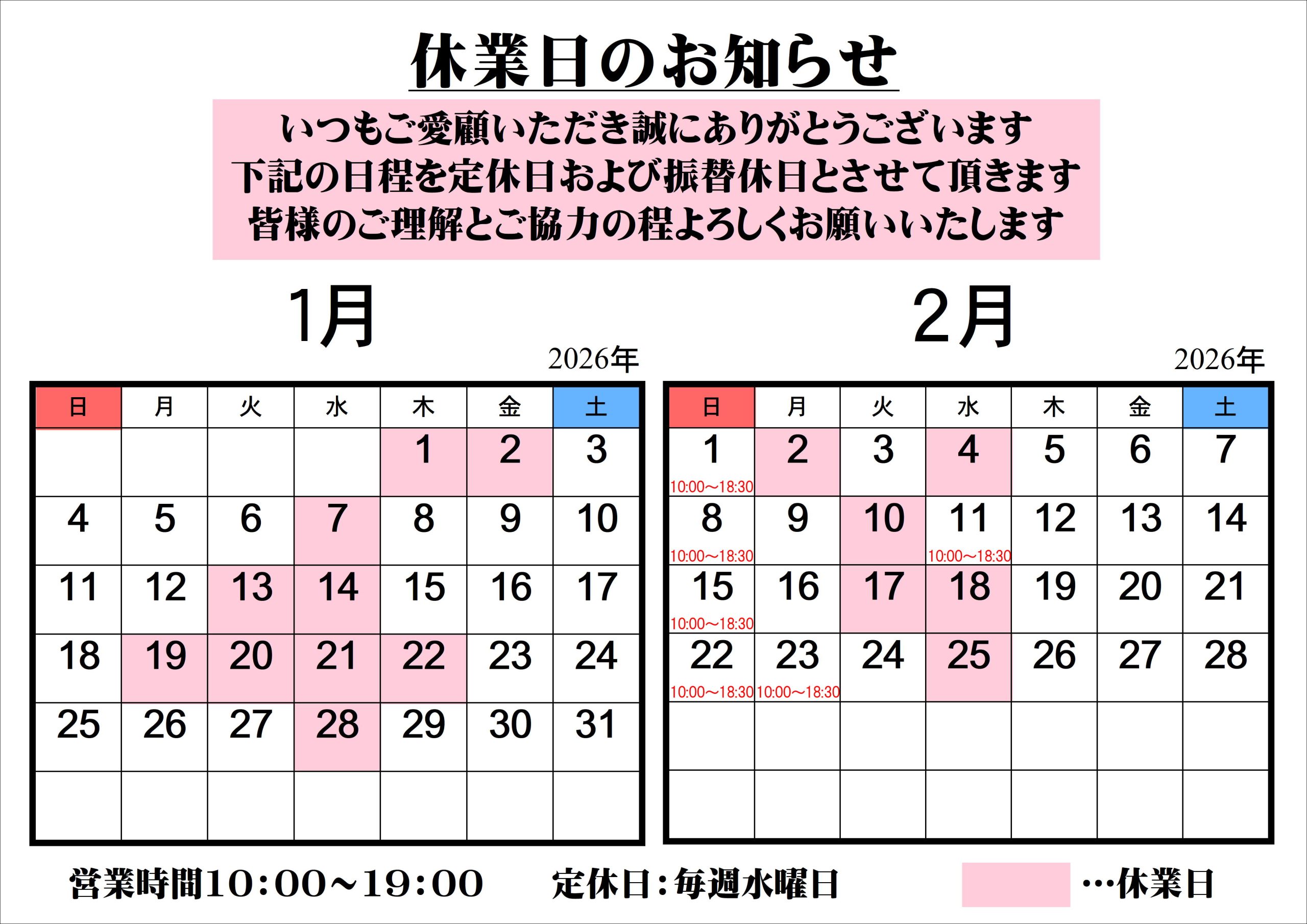 休業日のお知らせ【2026年1月・2月】